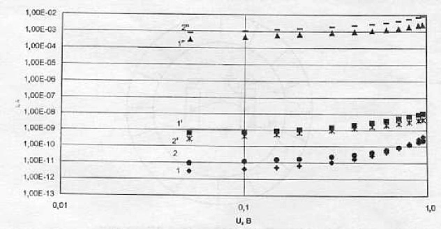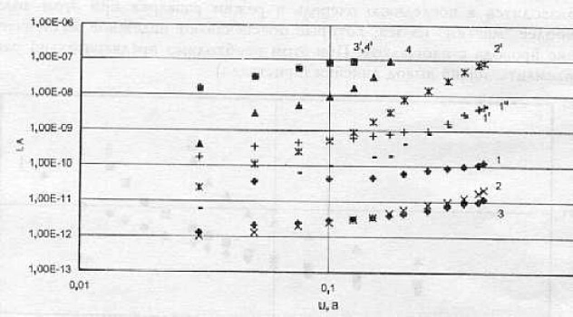 В связи с этим проведены три серии экспериментов. В первой серии для базовой топологии (когда расстояние от границ площадок до ОК составляет 30 мкм, защита осуществляется анодной окисной пленкой (АОП) толщиной 500 А° и пленкой SiO толщиной 0,5 мкм) сравниваются обратные ветви ВАХ для четырех технологических схем формирования p+-n-перехода: