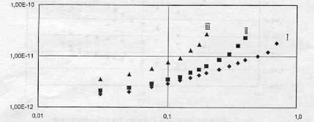 Третья серия экспериментов направлена на изучение возможностей технологических схем II и III при оптимизированных режиме и последовательности разварки для уменьшенного до 10 мкм расстояния между границами площадки и ОК и применения дополнительного слоя SiO под КП, где суммарная толщина SiO составляет ~1 мкм. На рис. 5 приведены типичные лучшие, средние и худшие обратные ветви ВАХ для обоих выбранных режимов формирования p+-n-переходов. Из рисунка следует, что несколько меньшие темновые токи достигнуты при применении ИФО. Сравнение данных табл. 1. и 2, в которых обобщены полученные результаты этих экспериментов, также свидетельствуют в пользу ИФО, так как в этом случае наблюдаются меньший коэффициент неидеальности ВАХ и больший выход годных (1<3·10-11 А) площадок, причем они имеют более низкий уровень темновых токов. Сравнивая лучшие результаты первой и третьей серий экспериментов следует отметить, что количество площадок, отвечающих требуемому уровню темнового тока, составлет для ИФО: 7 % - в первой серии экспериментов и 78 % - в третьей серии; для стационарного отжига при Т = 280°С - 10 % в первой серии и 46 % в третьей серии от общего количества площадок, что говорит о предпочтительности технологии и топологии в третьей серии экспериментов.