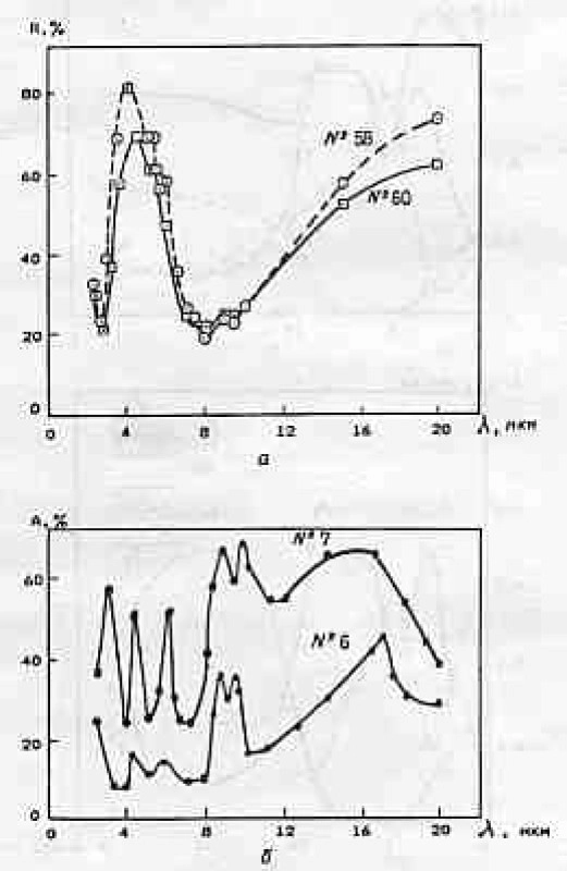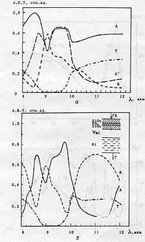 This paper presents the results of studies of sandwich and planar bolometric structures based on aSi:H and VO2 films accordingly. From the point of view of the TCR and resistivity value combanation both materials completely satisty the requirements of microbolometric array. Sandwiches constructed to act as an optical cavity absorb 80% of radiation at 8 mikron wavelength. It is shown that the planar structures absorption of 50-80% can be reached in the 8,5-10 mikron band.