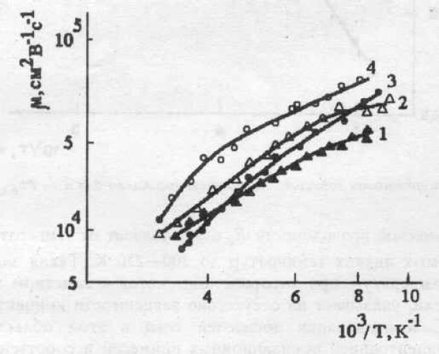 Films of PbBi1-xSnxSe (x = 0,03 - 0,7) doped by In atoms have been grown on the substrated of BaF2 (111, 100) by a molecular beam condensation method. Peculiarities of growth and their electrophysical properties have been investigated. The data on structure of films were obtained by electronographic, X-ray diffractometric and electron—microscopic methods. Epitaxial films by the thickness about 1–1,5 m m were obtained at the substrate temperature equal (400–450) ± 0,5 0C. The magnitudes of half-width of swinging curve of the X-ray diffraction changed within limits of W1/2 = 100–200 . The concentration and mobility of the charge carriers were n = (2–5) 1016 cm-3 and m = (2–3) 104 cm2/V s, accordingly. Films had a mirror-smooth surface by planes of growth (111, 100) on various substrates. The temperature dependences of a Hall coefficient Rí of the Pb1-xSnxSe doped by indium (0,3–0.5 mass. %) with different concentration of the charge carries were investigated. In is shown that mobility determined from Hall and electroconductivity measurements in the impurity conductivity region changes on degree-low m ~ T -n , where n = 1,6–2,5.